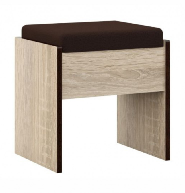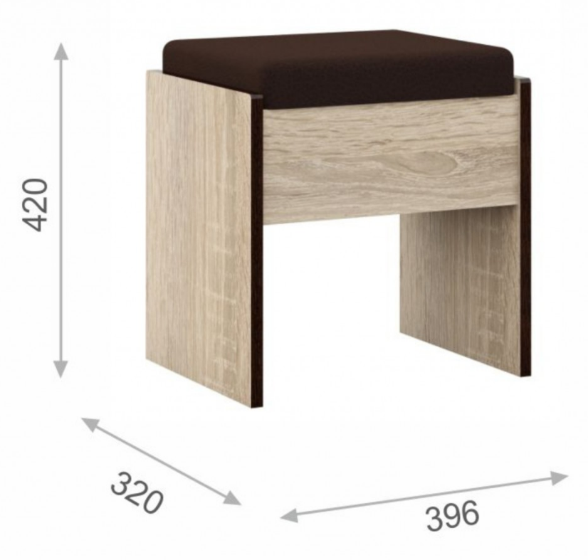 Пуф - украшение и функциональный предмет современного интерьера, который облагораживает помещение, делает его изящным и комфортабельным. Кромка цвета венге подчеркивают древесную текстуру и рисунок светлого дуба сонома, придает эффектный вид. Сиденье мягкое , обито экокожей. Идеально дополняет туалетный столик и другие модули системы Эшли.