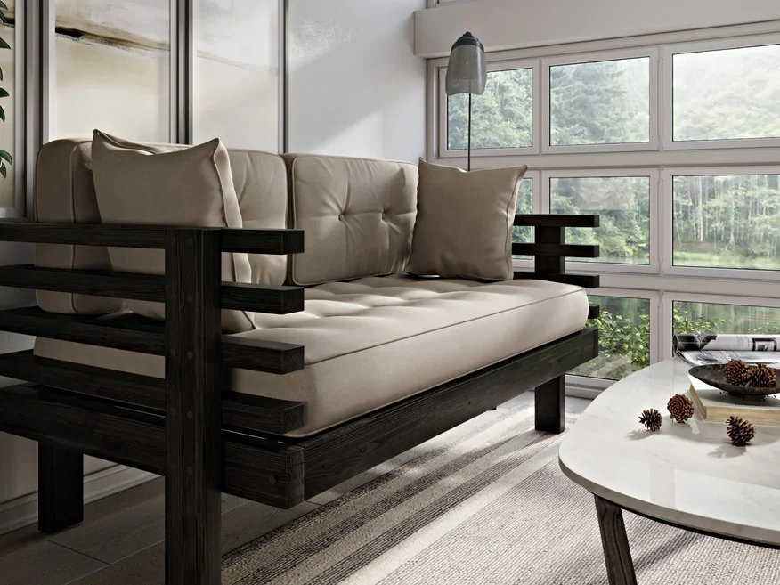 Комплект поставки: Каркас, матрас, две приспинные и две декоративные подушки