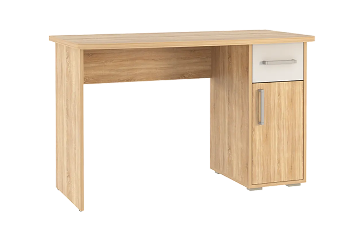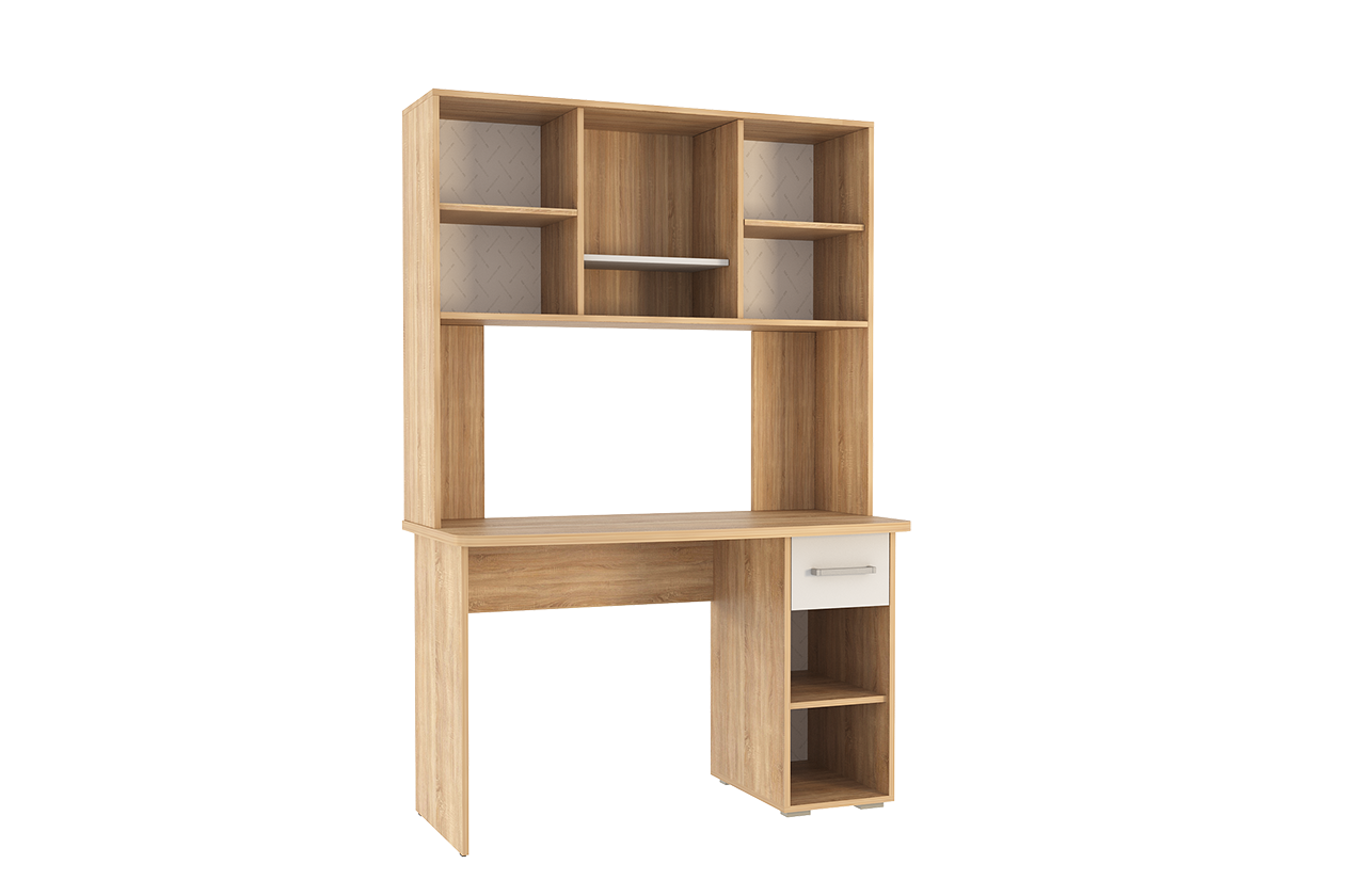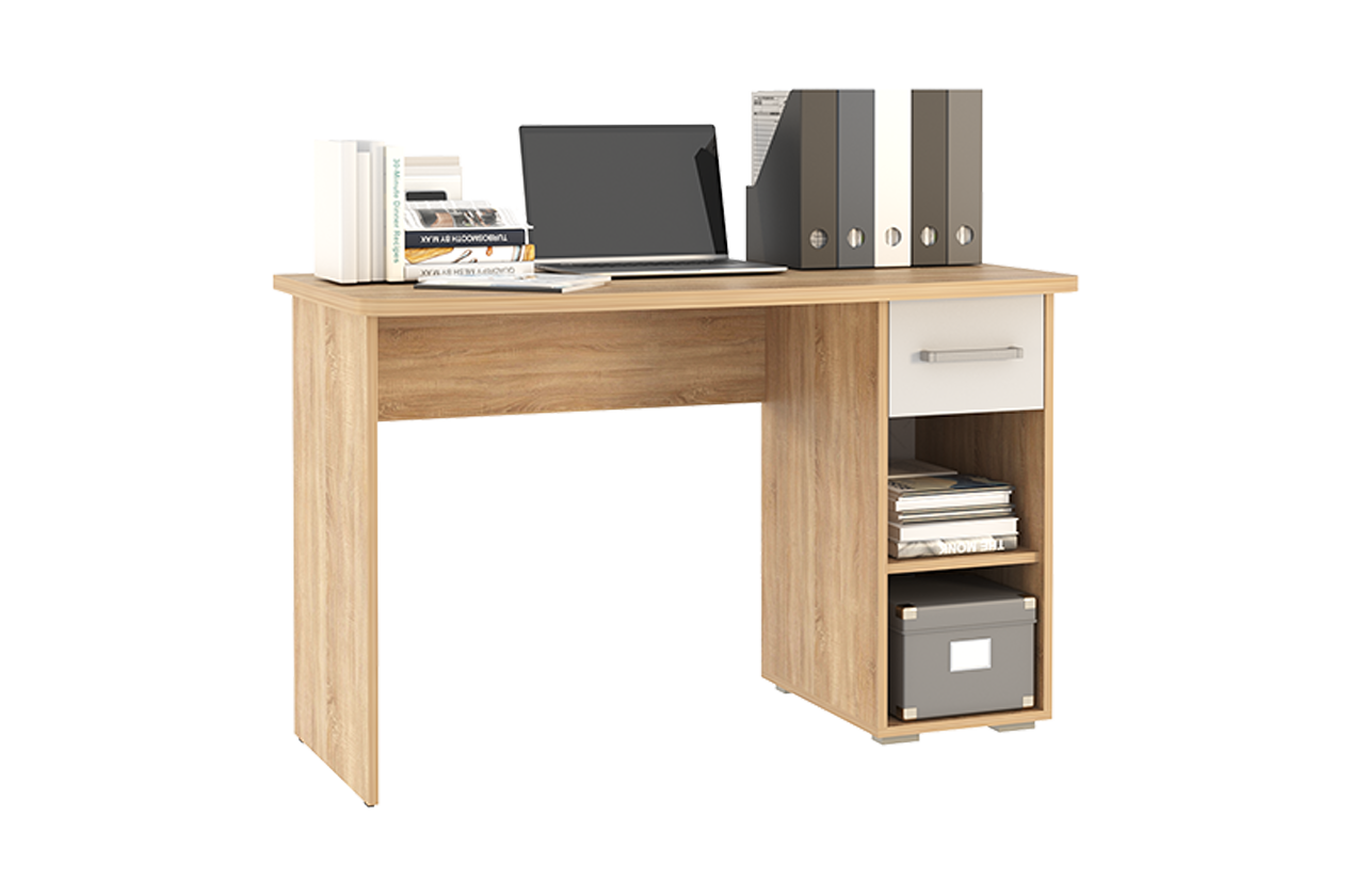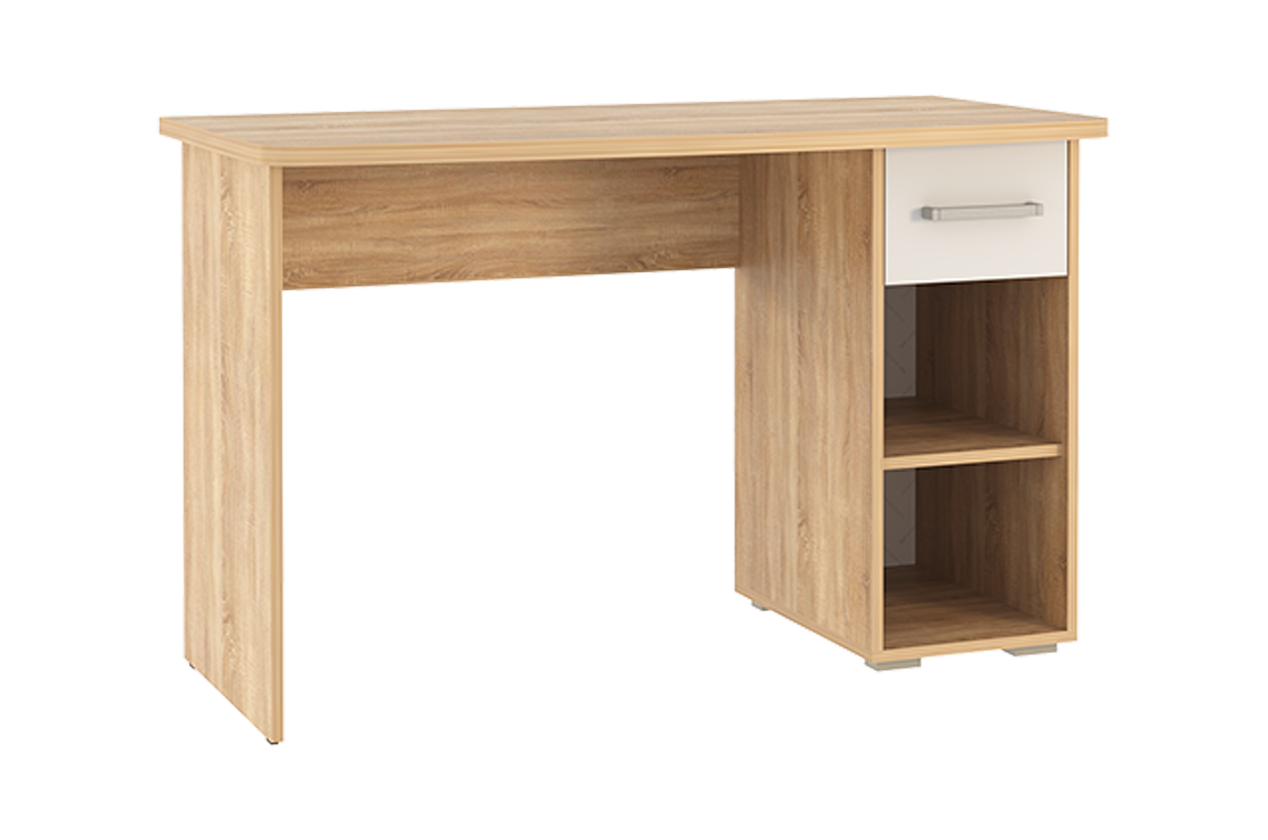 Стол выполнен из качественного материала ЛДСП в цвете дуб сонома с белыми элементами. Особенностью дизайна являются радиусные элементы и утолщенная столешница толщиной 25 мм. Для расширения функциональности стола рекомендуется дополнить его надстройкой и стеллажом из той же серии Лайт-1.