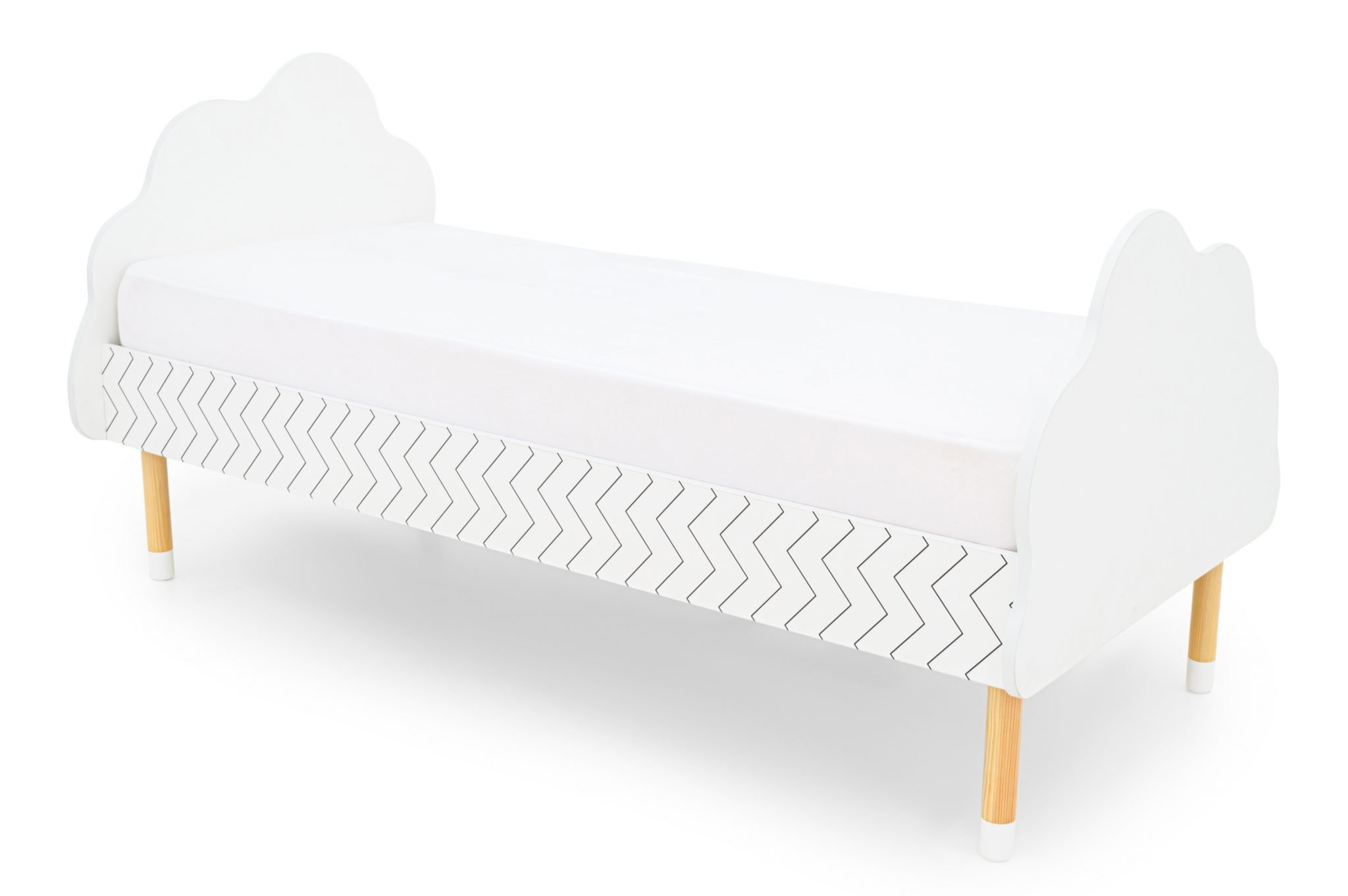Изголовье и изножье кроватки сделаны в виде облака. Высота от пола до самого высокого места составляет 66 см. Это позволяет даже маленькому ребенку комфортно забираться и спускаться с нее, не рискуя упасть. Специальная конструкция кровати позволяет с лёгкостью присесть или прилечь рядом взрослому, если ребенок не может заснуть.