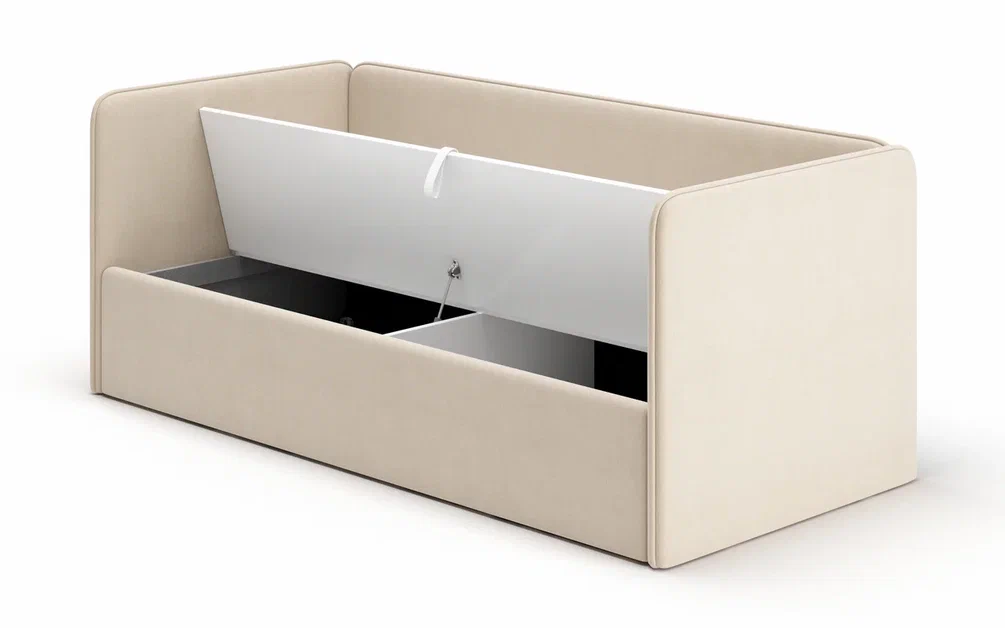 Вместительный ящик-книжка позволит хранить не только постельное бельё, но и игрушки. Дно ящика выполнено из ЛХДФ, борта - ДСП, обшитые файбертексом, разделитель – ЛДСП.