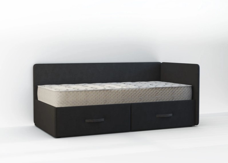 Модель оснащена выкатным ящиком для белья. При изготовлении кровати использованы качественные материалы. Корпус кровати выполнен из экологичных материалов: массива сосны и фанеры. Мягкость боковин и высокой спинки обеспечивает безопасный для здоровья наполнитель – ППУ и синтепон. Основание реечное на лентах. Вы можете выбрать обивку в велюре или рогожке в любом цвете.