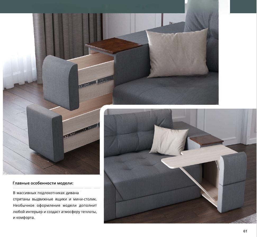 Прямой диван "Альянс-А" имеет формованные подушки без утяжки. Дополнительная опора защищает спинку дивана от провисания. В массивных боковинах спрятаны выдвижные ящики и небольшой столик.