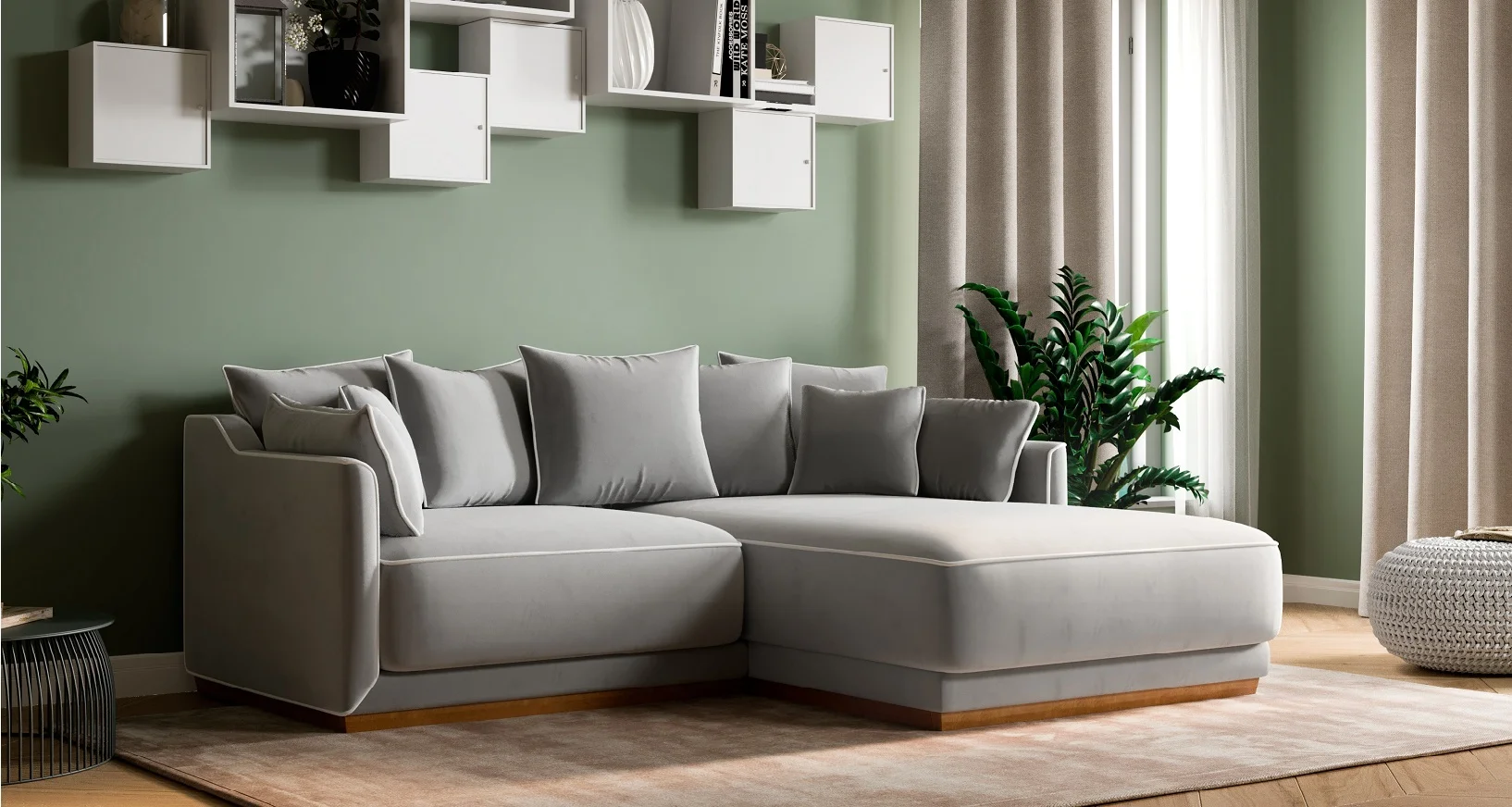 В этом диване гармонично сочетаются удобное, глубокое посадочное место и мягкие пуховые подушки. Изюминкой модели являются декоративные канты на самом диване и на всех подушках. Для хранения спальных принадлежностей предусмотрено большое отделение в оттоманке.