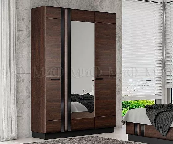 Вместительный трехдверный шкаф "Магнолия" предназначен для хранения белья и одежды в спальне или гостиной. Шкаф имеет широкую секцию, оборудованную металлической штангой для вешалок и двумя полками, и узкую секцию с полками для белья. Центральный фасад декорирован высоким прямоугольным зеркалом.