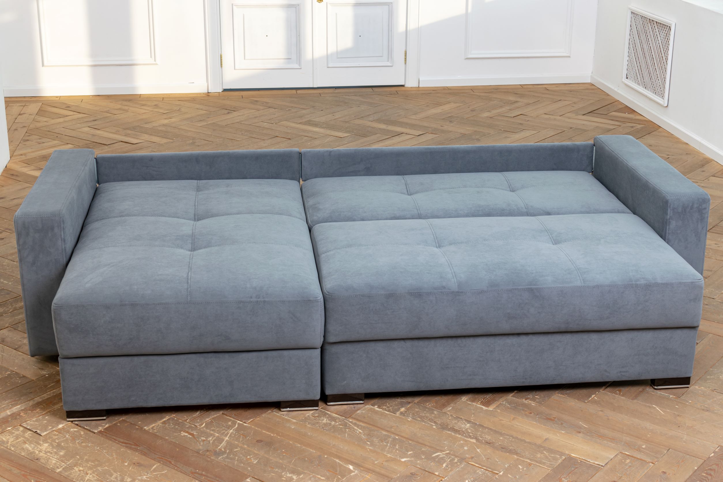 При раскладке дивана получается полноценная двуспальная кровать с ортопедическим матрасом. Габариты сп. места: 1550х2500. В наполнении – независимый пружинный блок, гипоаллергенный струттофайбер, синтепух (аналог лебяжьего пуха).