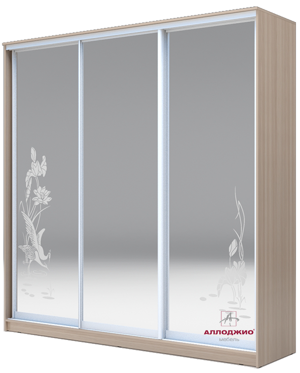Шкаф оснащен двумя дверями-купе с наполнением из зеркала серебро с пескоструйной обработкой и одной дверью-купе с наполнением из зеркала серебро.