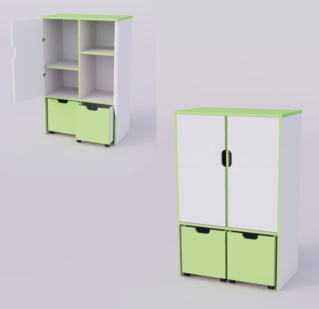 Закрытый стеллаж (4х секционный) «Зимний вечер» подходит для хранения методических материалов и игрушек. Есть 2 секции с закрывающимися дверцами и 2 выдвижных ящика.