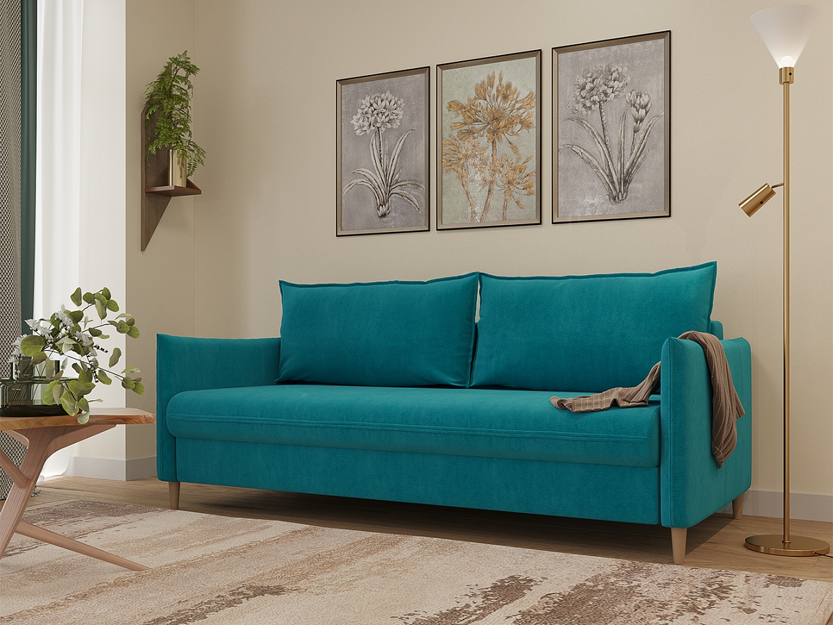 Декоративный кант идущий по краю сидения, подлокотникам и подушкам спинки подчеркивает и привлекает внимание, внося в интерьер легкость и элегантность. Высокие ножки выглядят основательно и придают модели устойчивость, это находка для тех, у кого дома робот пылесос.