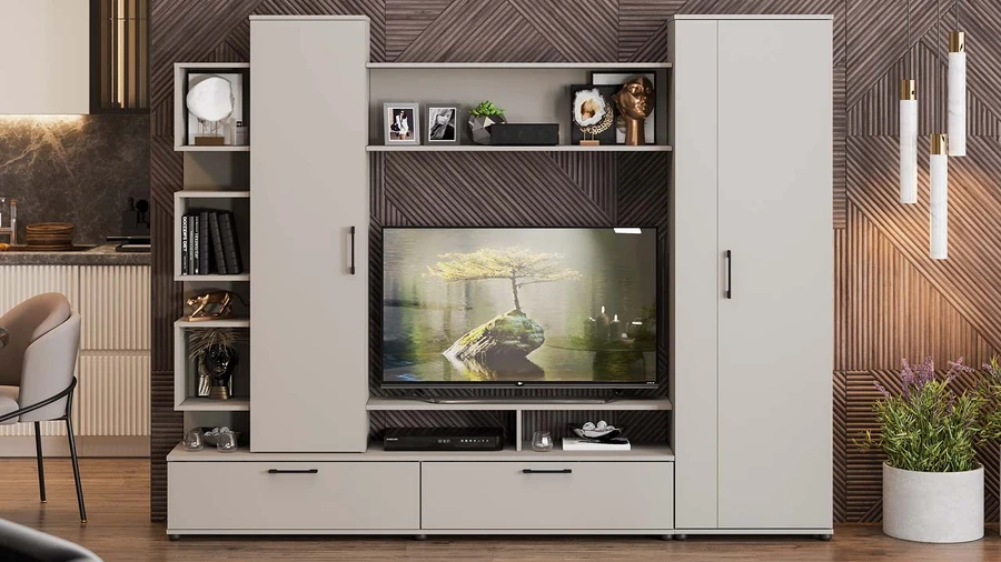 Удобная ниша под TV имеет размер: 1100 х 252 х 916 мм, а открытая полка под нишей позволит хранить различные аксессуары.
