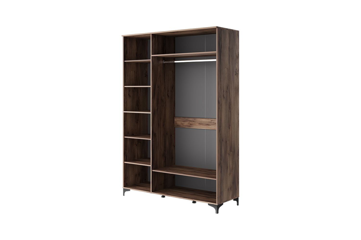 Шкаф с фрезерованными фасадами имеет три секции. За левой и правой расположены секции со штангой и полками. Посередине, за центральными дверьми, располагаются четыре полки для белья, а также два выдвижных ящика. Петли с доводчиками, шариковые направляющие полного выдвижения.