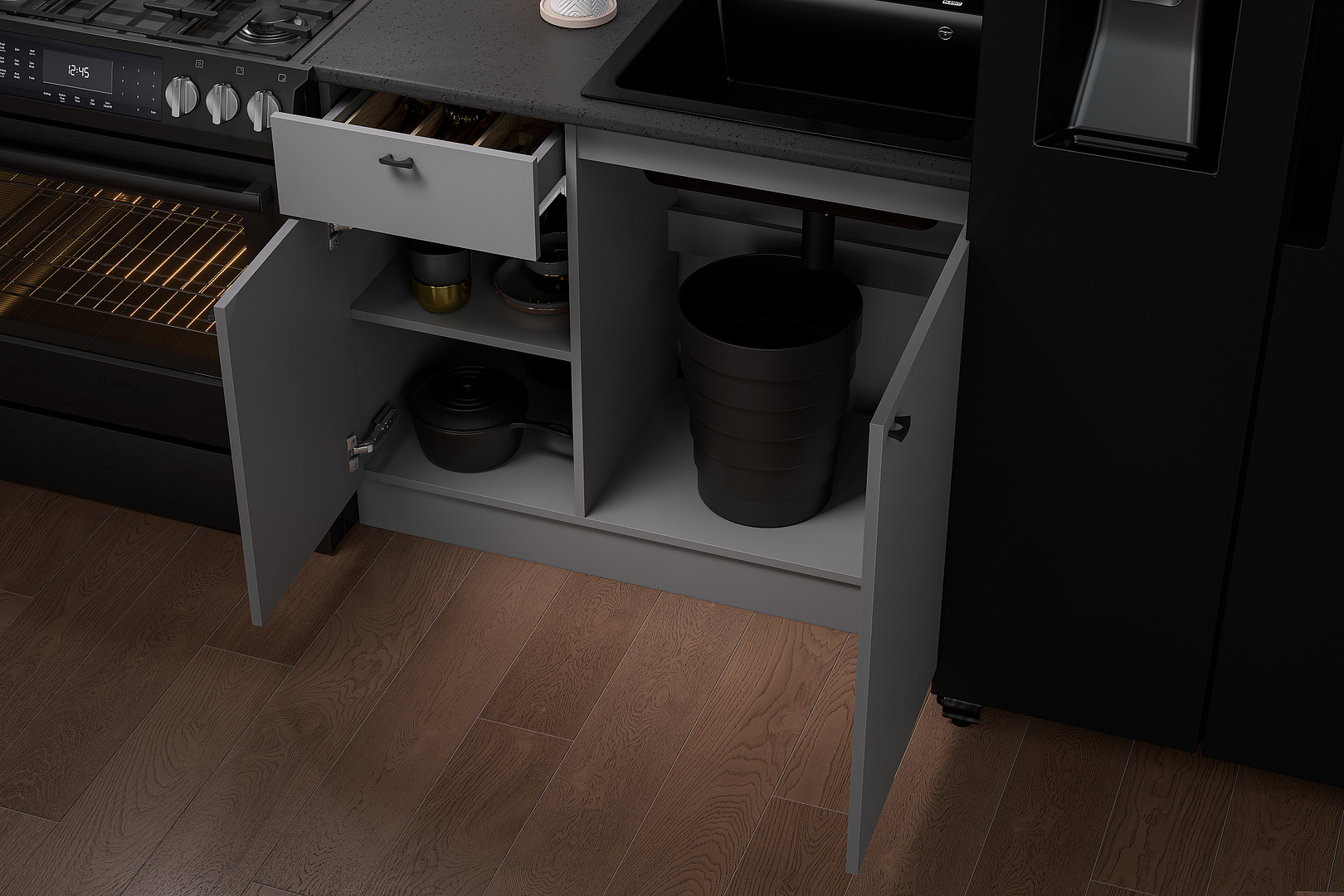 КГ Энни 1,0 создан для небольших кухонных пространств. Не смотря на небольшую длину - 1 м, его конструктив включает весь необходимый набор функций. Цельный верхний шкаф шириной 1 м и высотой 60 см на двух газлифтах и накаладных петлях прекрасно разместит столовый сервиз на 6 персон. Открытие этого шкафа осуществляется без использования наличной фурнитуры путем нижнего зацепа выступающего ниже вязки фасада. Открытая секция верхнего шкафа высотой 20 см идеальна как для хранения чайных и кофейных наборов, так и для таких необходимых на кухне баночек с сыпучими ингридиентами.