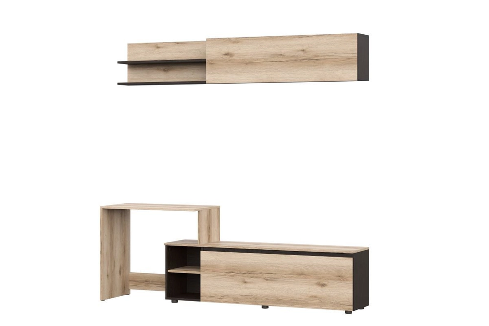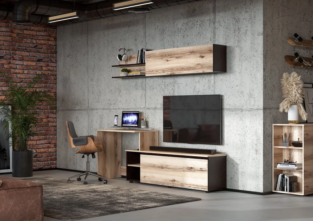 Сплошные чистые линии цвета Венге по фасадной группе благородного древесного декора создают современный универсальный силуэт помещения. Открытое полочное пространство верхней и нижней части тумбы идеально подходит для хранения книг, декоров, предметов шаговой доступности.