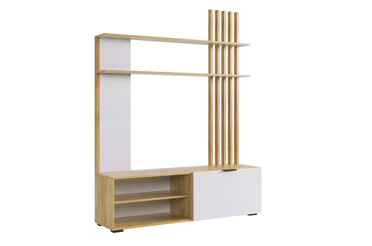 Гостиная Бери поможет оформить интерьер в соответствии с актуальными трендами дизайна. Декоративная фрезеровка на фасадах перекликается с вертикальными рейками, которые придают шкафной группе завершенный вид. За дверцами и на открытых полках достаточно места для хранения необходимых вещей, декора и сопутствующей техники.