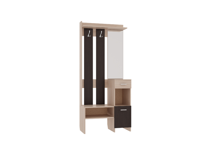 «Яр» создана для Вашей прихожей – Вы можете повесить одежду и сумку на металлические крючки, шапки положить на полку сверху, нужные мелочи – в выдвижной ящик. На открытых полках можно разместить зонты, перчатки и шарфы. Открытая и закрытая ниши для обуви. Займет минимум пространства Вашей прихожей.