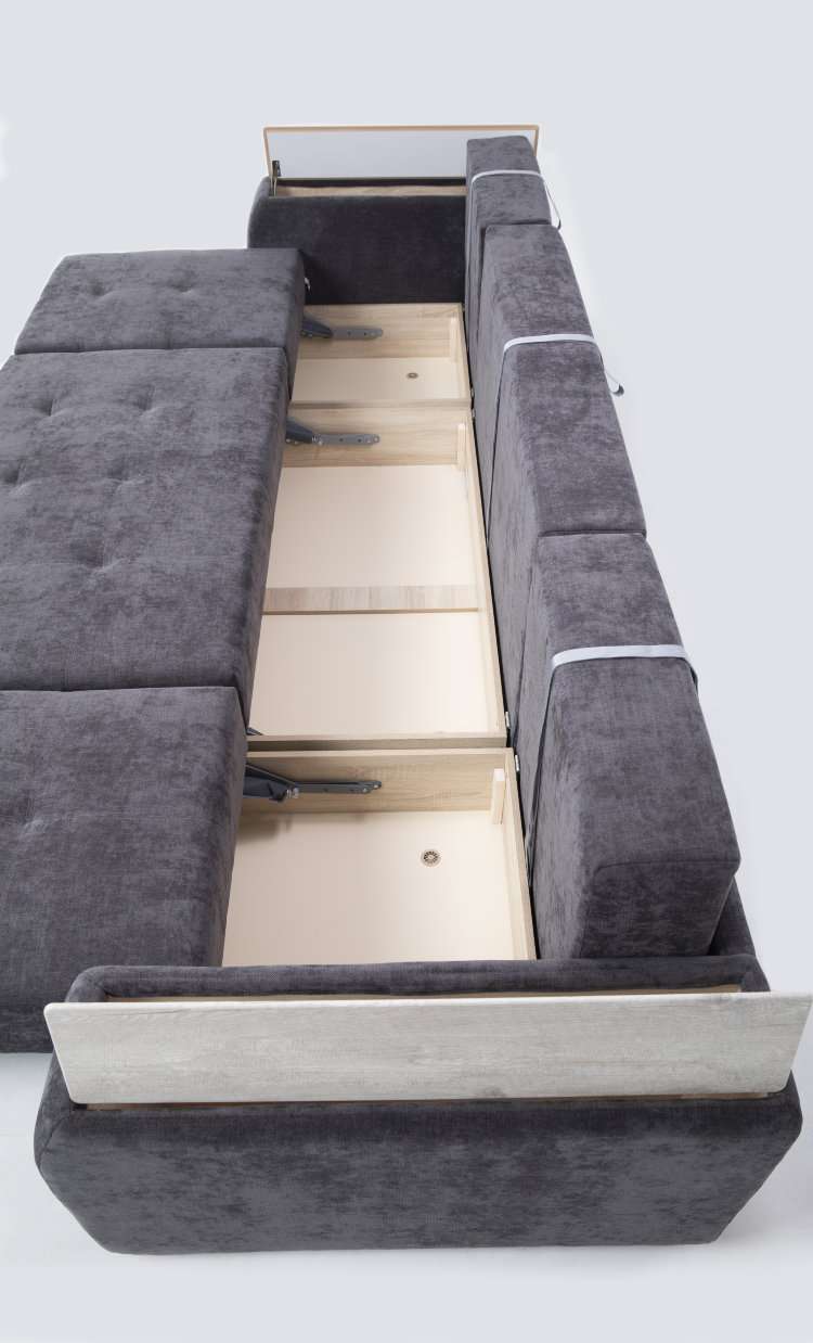 Вы легко сможете разложить диван с помощью механизма «тик-так» со стальными направляющими AURORA STEEL. А с ортопедическим наполнением AURORA FORM ваш сон на диване будет здоровым и крепким. Ниши для хранения расположены под посадочным местом и в подлокотниках.